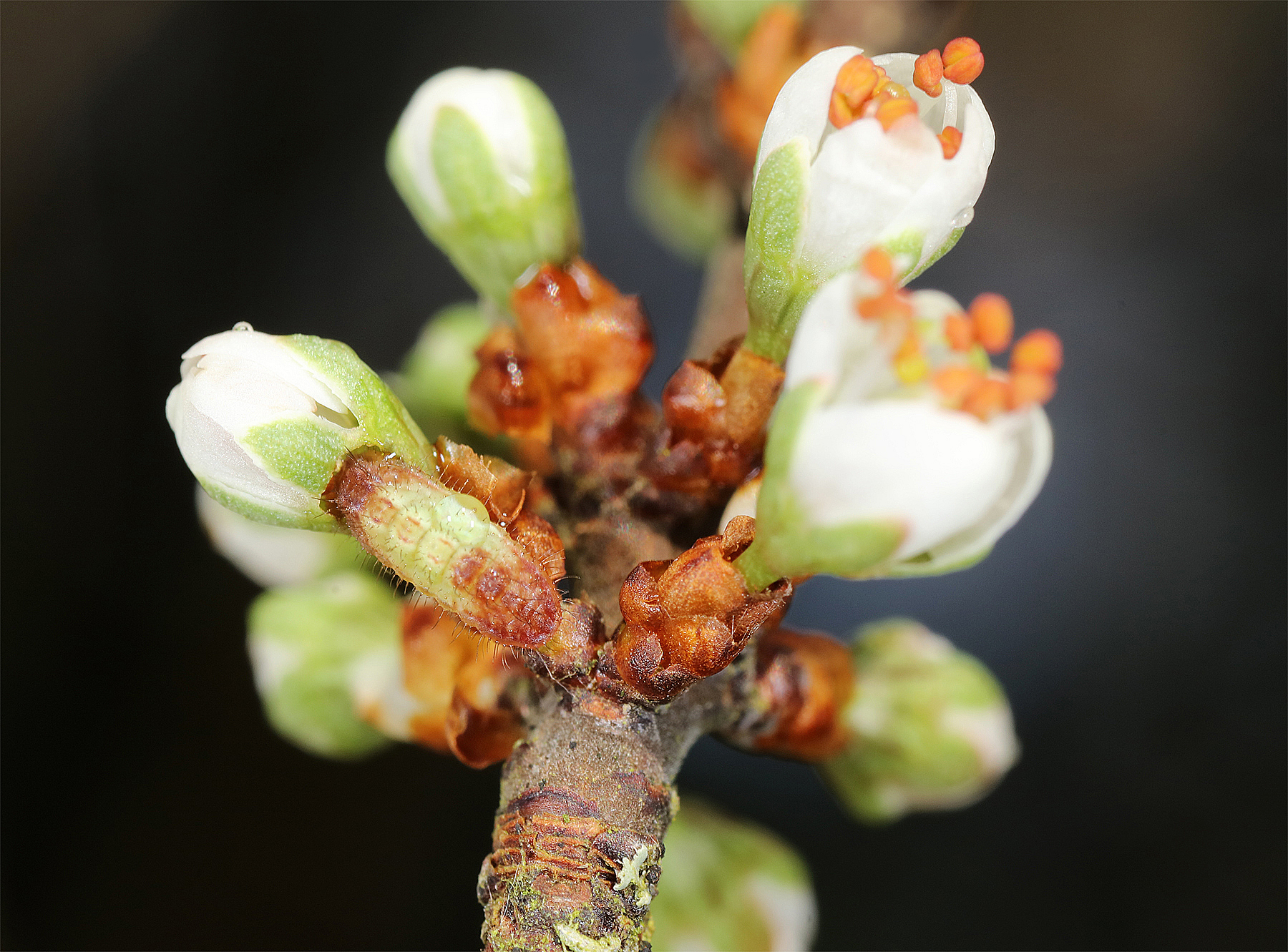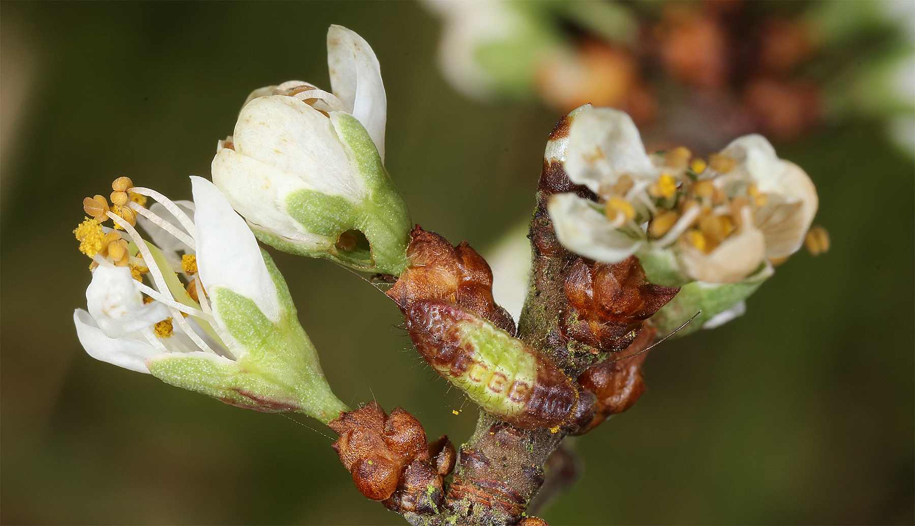 Chenilles sur les fleurs de Prunus Spinosa (Mimétisme)