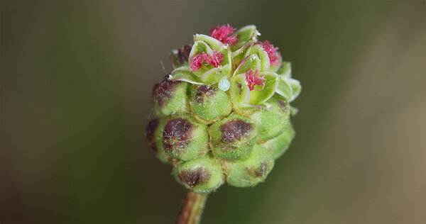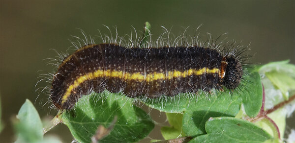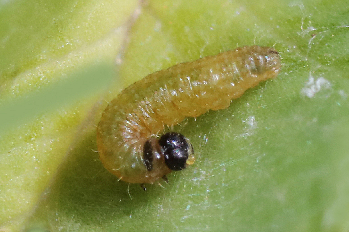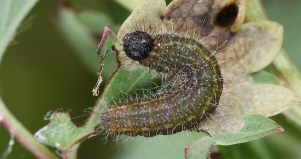 Chenille début L4 protégée à l’intérieur de son abri dans une feuille de "Sanguisorbe" tissée